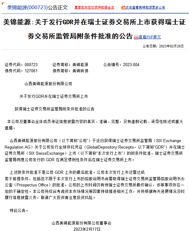 2月20日,美錦能源發(fā)布公告稱:公司于近日獲得瑞士證券交易所監(jiān)管局關(guān)于公司發(fā)行全球存托憑證(GDR)并在瑞士證券交易所上市的附條件批準,瑞士證券交易所監(jiān)管局同意公司發(fā)行的GDR在滿足慣例性條件后在瑞士證券交易所上市。