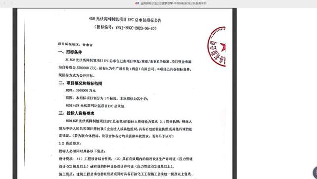 通報還稱,6月12日,該公司在區(qū)市場監(jiān)管局注冊全資子公司中廣通科技(酒泉)有限公司。6月13日,中廣通科技(酒泉)有限公司工作人員嚴(yán)微明向項目聯(lián)系人、區(qū)工信局副局長馬斌提交公司營業(yè)執(zhí)照復(fù)印件、《“離網(wǎng)制氫”項目投資合作協(xié)議》兩份資料,由馬斌代其在甘肅省政務(wù)網(wǎng)在線審批監(jiān)管平臺提交了項目備案申請,區(qū)發(fā)改局政務(wù)大廳首席代表李倩在向分管領(lǐng)導(dǎo)王泉德匯報,并向酒泉新能源綜合利用產(chǎn)業(yè)園管理辦公室副主任閆斌征求意見后,為該公司辦理了項目備案。6月21日,中廣通科技(酒泉)有限公司在未進(jìn)行項目可行性研究,未辦理項目規(guī)劃、土地、環(huán)評等前期手續(xù),也未與相關(guān)部門溝通的情況下,在“中國招投標(biāo)公共服務(wù)平臺”發(fā)布了《4GW光伏離網(wǎng)制氫項目EPC總承包招標(biāo)公告》。