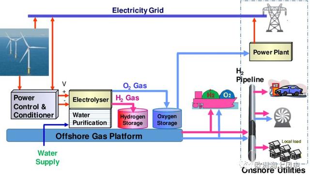Dolphyn則是由ERM公司開發(fā)的、基于浮式風(fēng)電的電解制氫技術(shù),即在浮式風(fēng)機平臺上配置制氫設(shè)備,風(fēng)機發(fā)電就地制氫,然后通過管道將氫氣輸送到岸上。