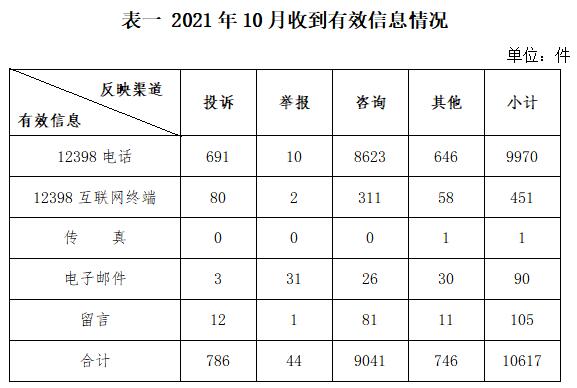 按反映渠道分類,12398電話9970件,12398互聯(lián)網(wǎng)終端451件,傳真1件,電子郵件90件,留言105件。