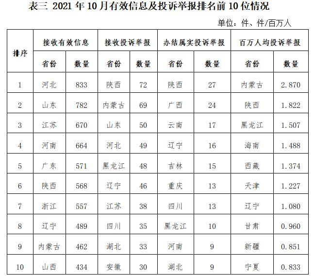 各省(自治區(qū)、直轄市)按照接收的有效信息數(shù)量排序,河北、山東、江蘇、河南、廣東、陜西、浙江、遼寧、內(nèi)蒙古、山西列全國前10位;按照接收的投訴舉報(bào)數(shù)量排序,陜西、內(nèi)蒙古、山東、河北、黑龍江、遼寧、江蘇、四川、湖北、安徽排在全國前10位;按照辦結(jié)屬實(shí)的投訴舉報(bào)數(shù)量排序,陜西、廣西、云南、遼寧、吉林、重慶、四川、黑龍江、河南、湖北排在全國前10位;按照百萬人均投訴舉報(bào)數(shù)量排序,內(nèi)蒙古、陜西、黑龍江、海南、西藏、天津、遼寧、甘肅、新疆、寧夏排在全國前10位。(2021年10月有效信息及投訴舉報(bào)排名前10位情況見表三)