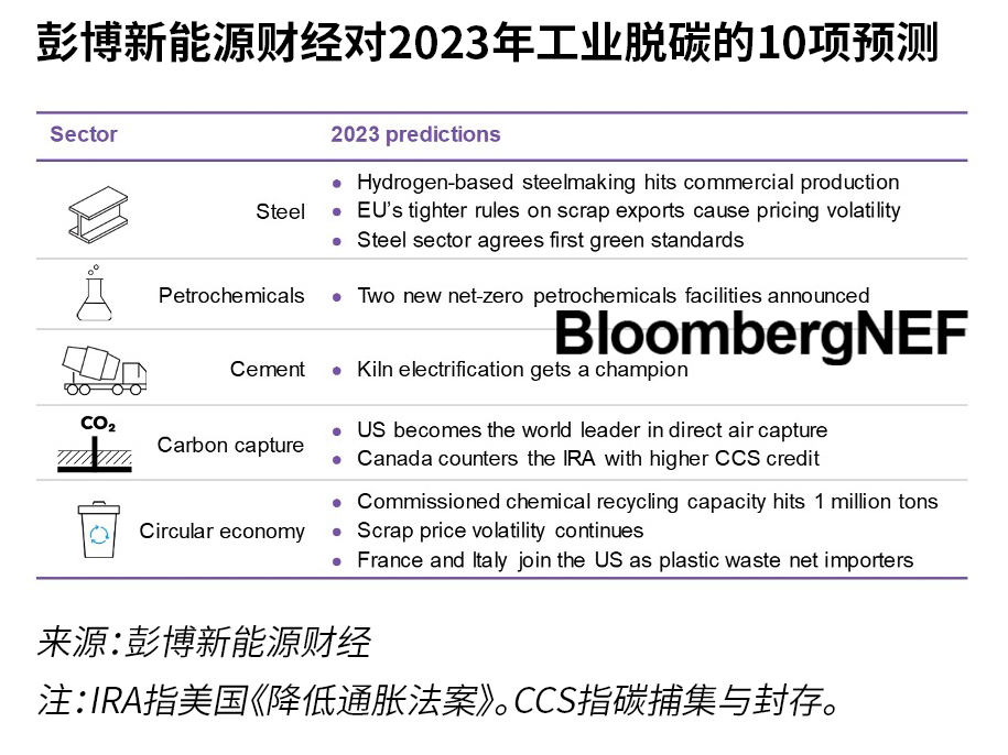 長期以來被認(rèn)為難以減排的工業(yè)部門正在以比預(yù)期更快的速度脫碳。歐洲已經(jīng)開始綠鋼試點(diǎn)生產(chǎn),水泥廠正在宣布全面的碳捕集裝置,加拿大和法國正在建造凈零石化綜合設(shè)施。2023年還會(huì)有更多此類行動(dòng)。