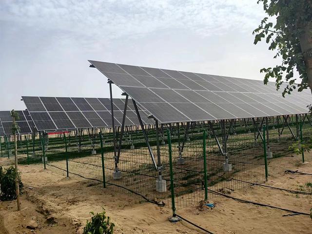 該項目在引用已經(jīng)示范驗收的沙漠土壤化改造、旱生作物種植及改良、高效節(jié)水等現(xiàn)代農(nóng)業(yè)技術(shù)的基礎(chǔ)上,首次嘗試農(nóng)光互補(bǔ)的模式。