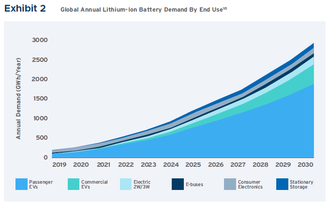 根據(jù)RMI公司的研究和彭博新能源財經(jīng)公司的分析,到2030年,全球?qū)︿囯x子電池的需求預(yù)計(jì)將達(dá)到每年2.8TW。其中大部分將滿足電動汽車需求。
