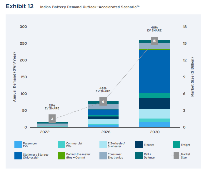 印度在先進(jìn)電池技術(shù)制造方面的影響力如今微不足道。然而,該國擁有大規(guī)模電池制造的巨大潛力。報告指出,到2030年,印度的電池市場可能超過150億美元(約合1.12萬億盧比),到2030年,印度的電池需求預(yù)計(jì)將在“加速情景”中上升到260GWh。