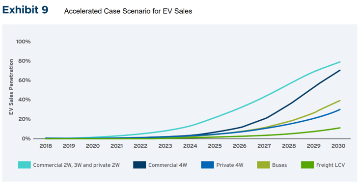 根據(jù)“加速情景”, 到2030年,電動汽車在新車銷售中的細(xì)分市場滲透率將達(dá)到私家車的30%、商用車的70%、公交車的40%以及兩輪和三輪車的80%。在“保守情景”中,預(yù)計(jì)2030年電動汽車在所有汽車細(xì)分市場的新銷量中的加權(quán)平均滲透率為35%。