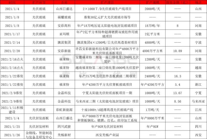 自去年12月16日工信部宣布放開光伏玻璃擴(kuò)產(chǎn)限制后,2021年開年至今,安彩高科、安彩新能、亞瑪頓紛紛加速光伏玻璃擴(kuò)產(chǎn)。1月8日,安彩高科宣布與博愛凌創(chuàng)合資成立焦作安彩新材料有限公司,開展年產(chǎn)18萬噸壓延太陽能電池封裝玻璃項(xiàng)目建設(shè)。1月17日,亞瑪頓旗下鳳陽硅谷智能有限公司二期項(xiàng)目“年產(chǎn)2億平方米特種超薄鍍膜雙玻組件用玻璃項(xiàng)目”在滁州舉行開工儀式。2月20日,安彩新能年產(chǎn)4800萬平方米光伏輕質(zhì)基板項(xiàng)目開工,項(xiàng)目投資10.89億,涵蓋1.8~4.0mm厚度光伏玻璃產(chǎn)品,支持超大規(guī)格電池組件。