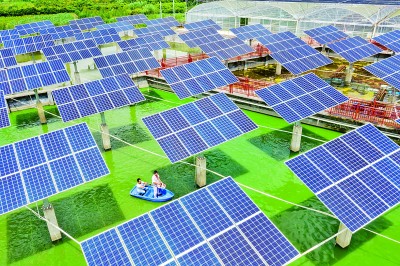 近年來,廣西壯族自治區(qū)蒙山縣因地制宜開展“光伏+漁業(yè)”的光伏發(fā)電項目,將原先一些洼澇地、荒地打造為“漁光互補”光伏電站,改變傳統(tǒng)的漁業(yè)養(yǎng)殖生產(chǎn)方式,實施農(nóng)光互補,既符合國家清潔低碳能源發(fā)展戰(zhàn)略,又為該縣鄉(xiāng)村振興增添新力量。圖為8月17日,工人在“漁光互補”村級光伏電站喂養(yǎng)魚蝦。何華文攝/光明圖片