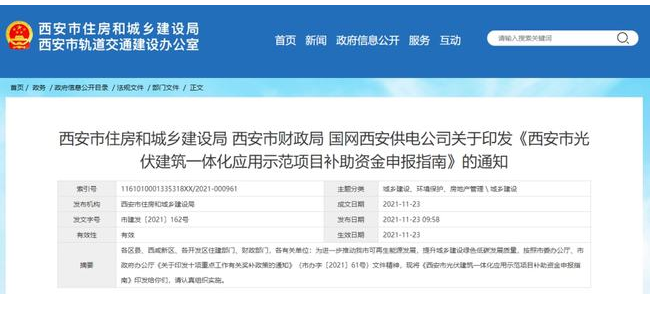 11月23日,西安市住房和城鄉(xiāng)建設(shè)局,西安市財(cái)政局,國網(wǎng)西安供電公司印發(fā)了《西安市光伏建筑一體化應(yīng)用示范項(xiàng)目補(bǔ)助資金申報(bào)指南》的通知。實(shí)施年限為2021~2023年。