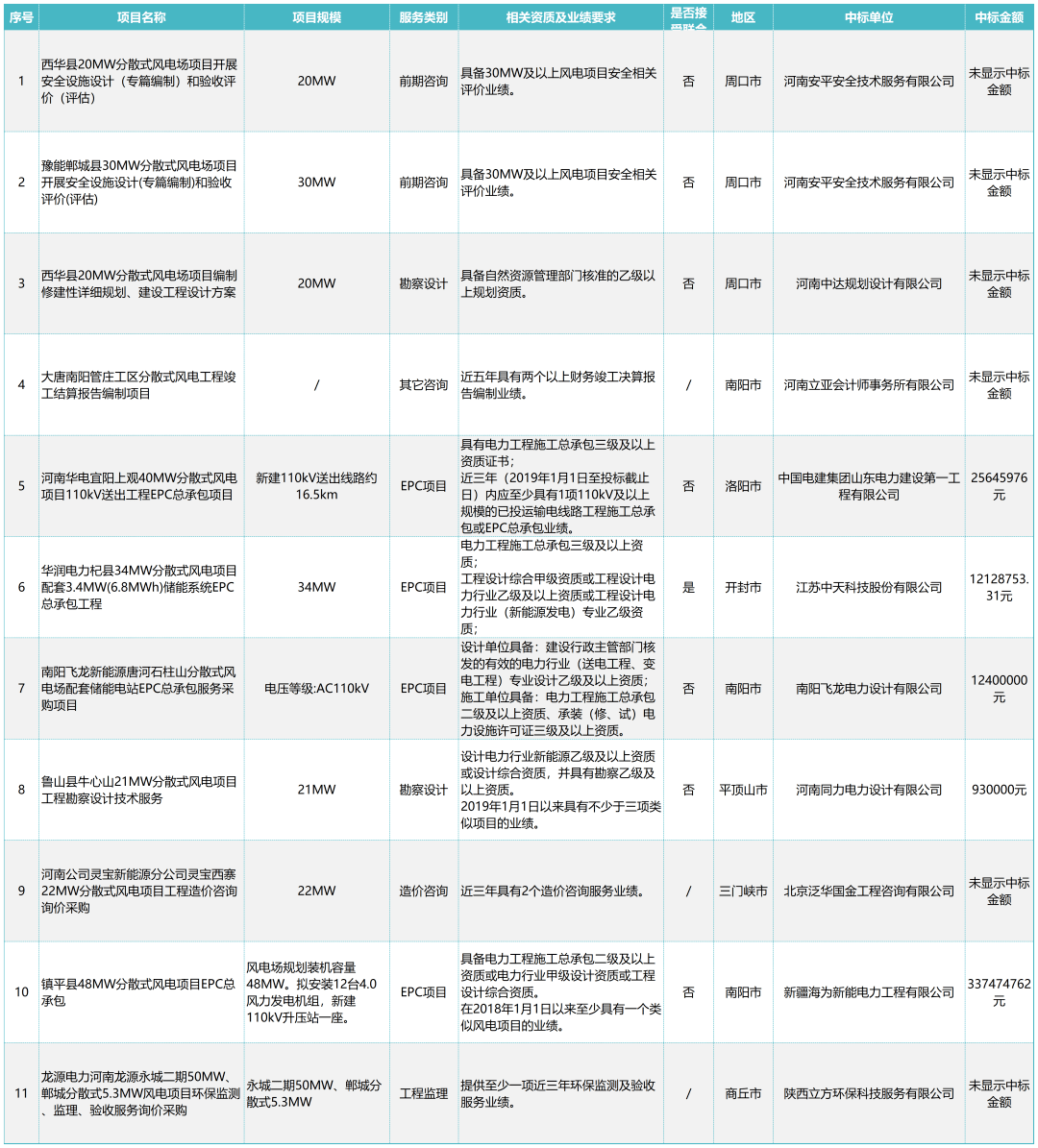 依據(jù)小海帶平臺2022年1月至7月統(tǒng)計數(shù)據(jù)顯示,河南省目前分散式風(fēng)電項目共11項,服務(wù)內(nèi)容涵蓋勘察設(shè)計、造價咨詢、工程監(jiān)理等,其中主要為勘察設(shè)計與前期咨詢,大部分項目還處于工程進展的前期階段。風(fēng)電項目占電力項目的比例不足20%,分散式風(fēng)電項目占風(fēng)電項目的比例僅22%左右,當(dāng)前整體規(guī)模并不大。