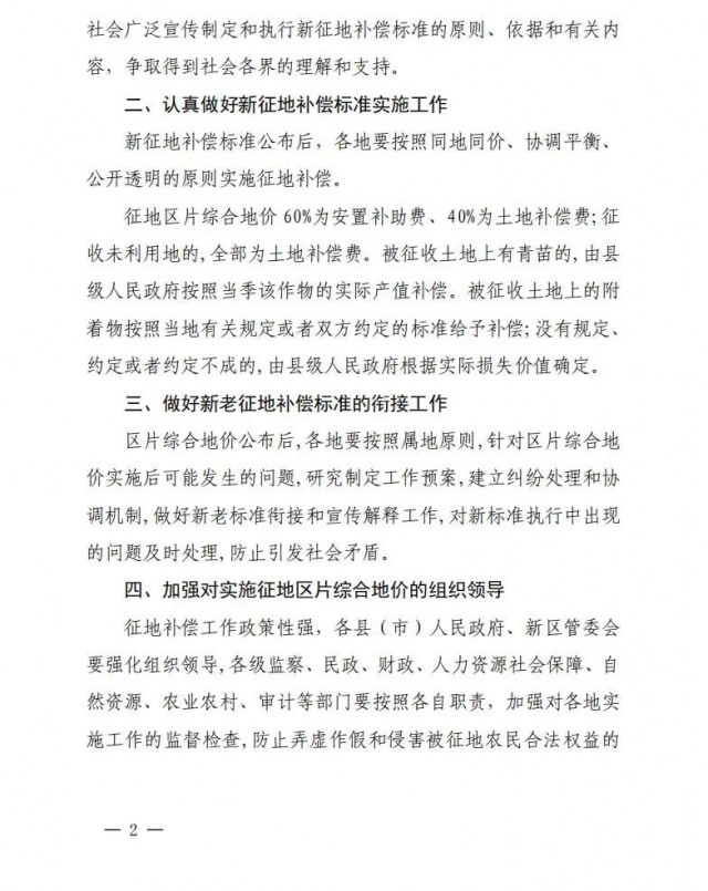 此外,根據(jù)黔西南州征地區(qū)片綜合地價(jià)補(bǔ)償更新標(biāo)準(zhǔn),各地要按照同地同價(jià)、協(xié)調(diào)平衡、 公開(kāi)透明的原則實(shí)施征地補(bǔ)償。征地區(qū)片綜合地價(jià)60%為安置補(bǔ)助費(fèi)、40%為土地補(bǔ)償費(fèi);征 收未利用地的,全部為土地補(bǔ)償費(fèi)。被征收土地上有青苗的,由縣級(jí)人民政府按照當(dāng)季該作物的實(shí)際產(chǎn)值補(bǔ)償。被征收土地上的附著物按照當(dāng)?shù)赜嘘P(guān)規(guī)定或者雙方約定的標(biāo)準(zhǔn)給予補(bǔ)償;沒(méi)有規(guī)定、 約定或者約定不成的,由縣級(jí)人民政府根據(jù)實(shí)際損失價(jià)值確定。