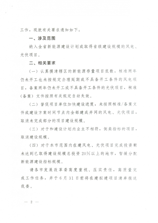 其中提及要認真摸清轄區(qū)的新能源存量項目底數(shù),核準兩年仍未開工也未按規(guī)定辦理延期或不具備開工條件的風(fēng)電項目,備案兩年仍未開工或不具備開工條件的光伏項目,核準(備案)文件按照有關(guān)規(guī)定自動失效。