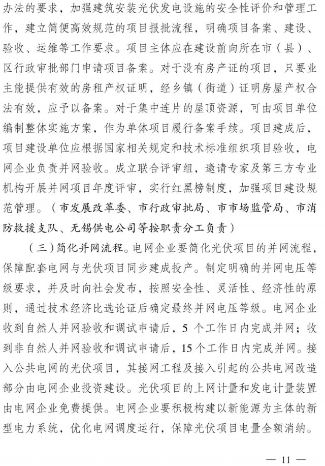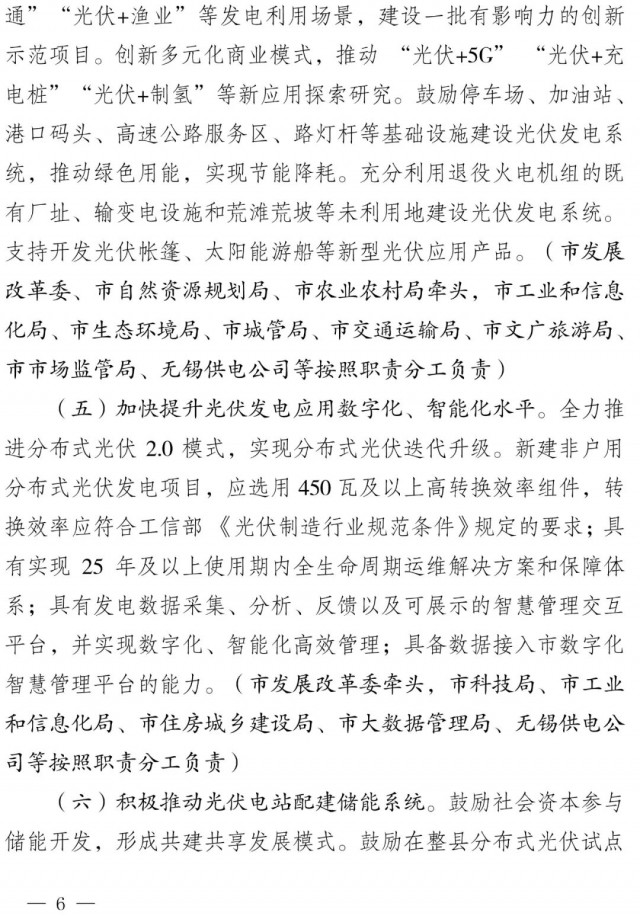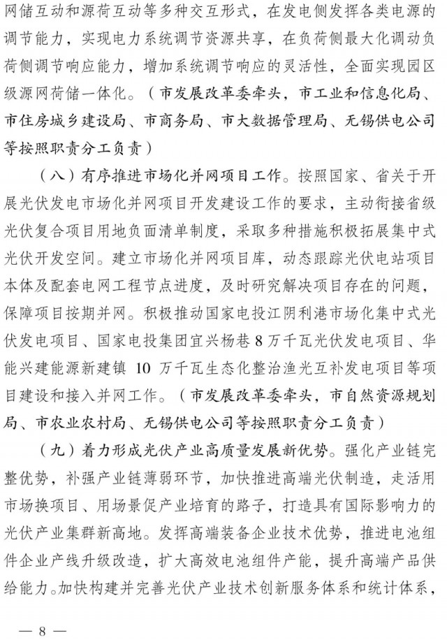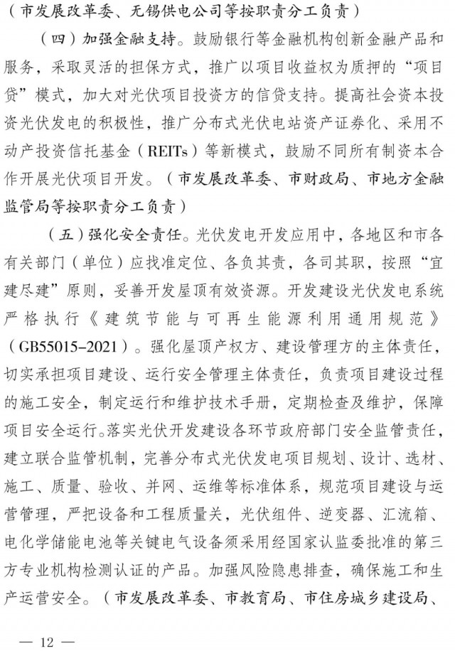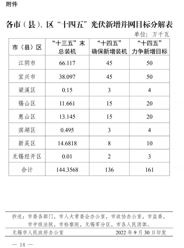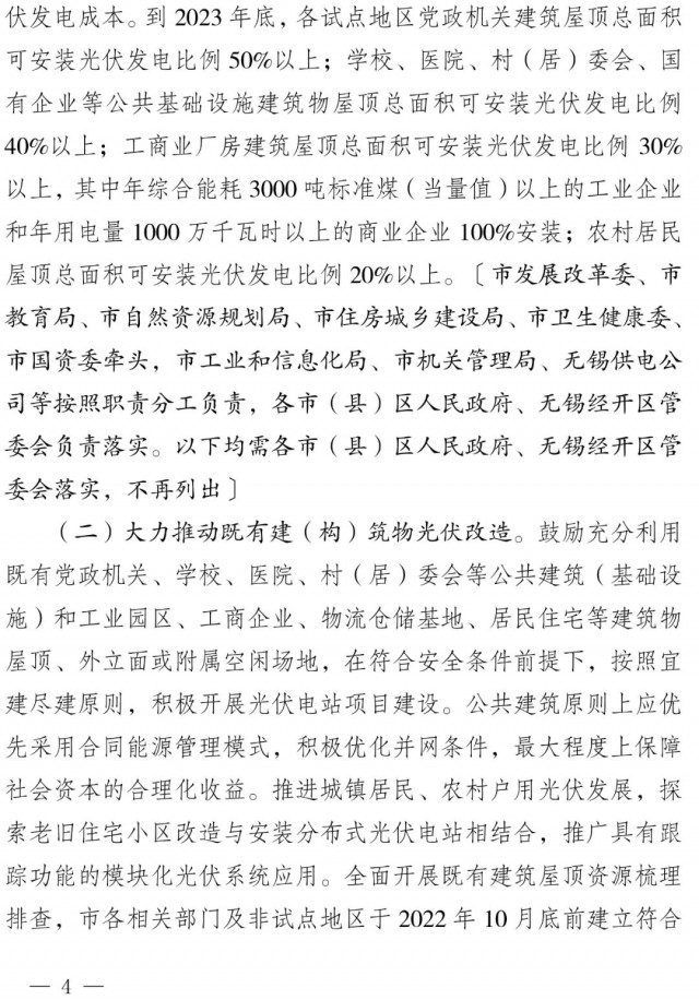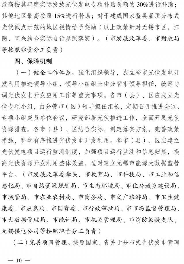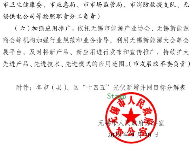 此外,“十四五”期間,對于完成新增并網(wǎng)目標,安排光伏發(fā)電補貼資金并落實補貼的地區(qū),市級自 2022年起分年度給予補助。對納入全國整縣(市、區(qū))屋頂分布式光伏開發(fā)試點的地區(qū),最高按其年度實際發(fā)放光伏發(fā)電專項補貼總額的30%進行補助;其他地區(qū)最高按照15%進行補助;對于建成國家整縣屋頂分布式光伏試點示范的地區(qū)視情給予獎勵(以上政策針對無錫市區(qū),江陰、宜興結合實際自行參照落實)。