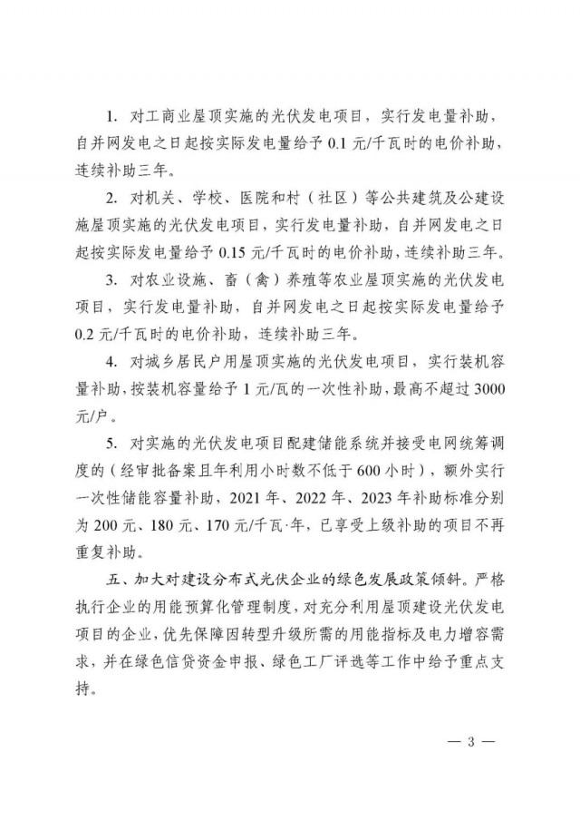 4.對城鄉(xiāng)居民戶用屋頂實施的光伏發(fā)電項目,實行裝機容量補助,按裝機容量給予1元/瓦的一次性補助,最高不超過3000元/戶。