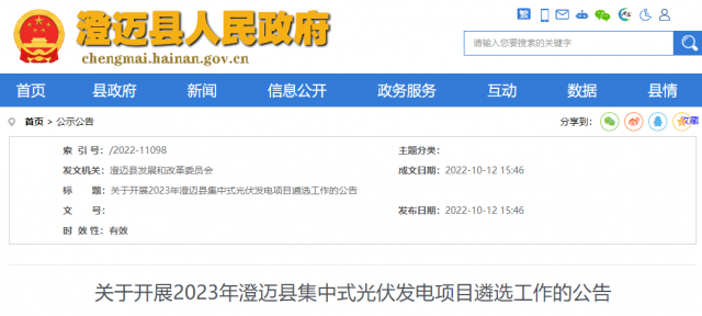10月12日,海南澄邁縣政府網發(fā)布“關于開展2023年澄邁縣集中式光伏發(fā)電項目遴選工作的公告”。