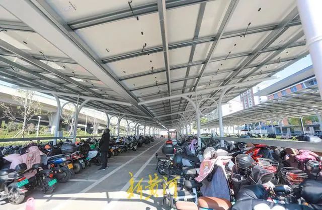 山東大學(xué)國家大學(xué)科技園停車場的車棚采用光伏一體化結(jié)構(gòu),光伏面板架設(shè)于停車位上方的鋼桁架上,以光伏電池板代替車棚頂面,既能避免車輛日曬雨淋,所發(fā)出的電力又能為園區(qū)、車棚提供照明,起到一舉多得的效果。車棚內(nèi)安裝了充電樁、儲能等配套設(shè)施,可以為電動汽車、電動自行車充電,實現(xiàn)了光儲充一體化,綠色低碳場景再添新貌,進一步邁向智慧零碳園區(qū)。