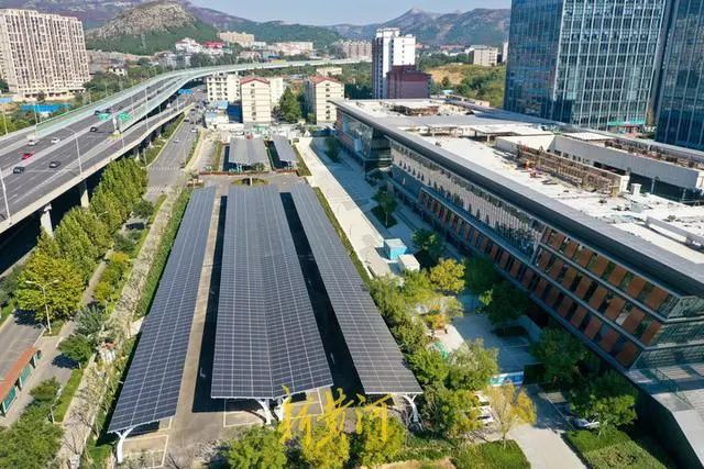 10月19日,濟南市中區(qū)山東大學(xué)國家大學(xué)科技園的露天停車場新加裝了光伏車棚,光伏停車場在高空俯瞰之下格外壯觀。