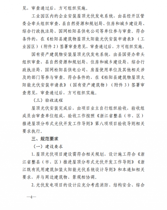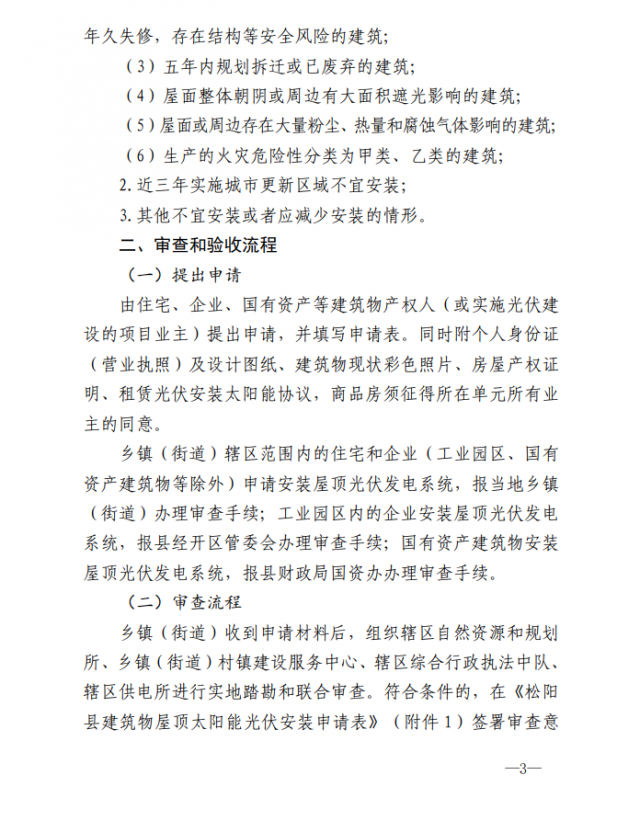 2、審查和驗收流程:建筑產(chǎn)權人或光伏項目業(yè)主提出申請,填寫《松陽縣建筑物屋頂太陽能光伏安裝申請表》并附相關申請資料,按照所屬區(qū)塊報屬地鄉(xiāng)鎮(zhèn)街道或縣經(jīng)開區(qū)管委會牽頭組織審查,國有資產(chǎn)屋頂建設光伏項目報縣財政局國資辦組織審查。自然資源和規(guī)劃局、住房和城鄉(xiāng)建設局、綜合新增執(zhí)法局、國網(wǎng)松陽縣供電公司等相關部門或其下屬派出機構參與審查。符合條件的,各審查單位在申請表中簽署審查意見,方可組織實施。建設完成后,項目業(yè)主自主驗收,審查單位參與驗收,驗收工作按照《浙江省整縣(市、區(qū))推進屋頂分布式光伏開發(fā)工作導則》第八項項目驗收導則相關要求執(zhí)行。