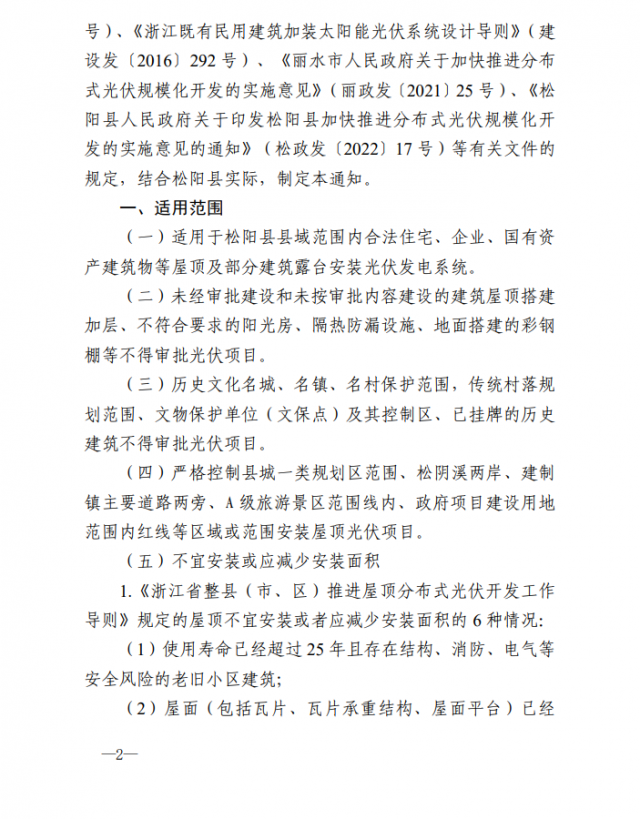 1、適用范圍:適用于松陽縣縣域范圍內(nèi)合法住宅、企業(yè)、國有資產(chǎn)建筑物等屋頂及部分建筑露臺安裝光伏發(fā)電系統(tǒng),并說明補充5類不得安裝或不宜安裝及減少安裝的情形。