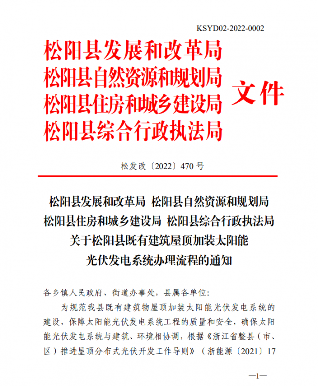 11月8日,浙江松陽縣發(fā)展和改革局關于松陽縣既有建筑屋頂加裝太陽能光伏發(fā)電系統(tǒng)辦理流程的通知印發(fā),通知對既有建筑屋頂加裝太陽能光伏發(fā)電系統(tǒng)適用范圍、審查和驗收流程以及規(guī)范要求做出詳細規(guī)定。