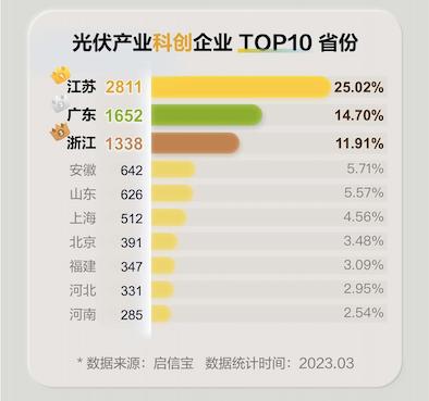 光伏產(chǎn)業(yè)技術(shù)迭代速度迅猛,屬于科技含量較高的成長性行業(yè),啟信寶產(chǎn)業(yè)鏈數(shù)據(jù)庫從企業(yè)技術(shù)創(chuàng)新、科創(chuàng)資質(zhì)、研發(fā)實力、企業(yè)成長性以及行業(yè)潛力5個維度對光伏企業(yè)進(jìn)行科創(chuàng)能力“掃描”后發(fā)現(xiàn),光伏產(chǎn)業(yè)鏈中,科創(chuàng)企業(yè)主要集中在江蘇、廣東、浙江三省,三省的科創(chuàng)企業(yè)數(shù)量約為2800家、1600家、1300家左右,分別占比25.02%、14.70%以及11.91%。江蘇成“存續(xù)企業(yè)”“科創(chuàng)企業(yè)”數(shù)量雙料榜首。