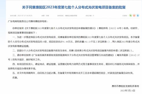 廣東惠州市惠陽(yáng)區(qū)發(fā)改局: 同意182.23千瓦個(gè)人分布式項(xiàng)目備案