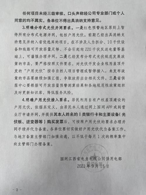 據(jù)網(wǎng)絡媒體消息:近日,國網(wǎng)江西省下發(fā)《關(guān)于進一步明確分布式光伏消納和并網(wǎng)服務有關(guān)事項的通知》,明確要求紅色預警地區(qū)暫停戶用光伏并網(wǎng),對光伏開發(fā)企業(yè)租用屋頂開發(fā)的“戶用光伏”按非自然人項目管理或暫停接入,加強出具“消納意見”的管理,任何項目未經(jīng)三級審核均不得出具消納意見。