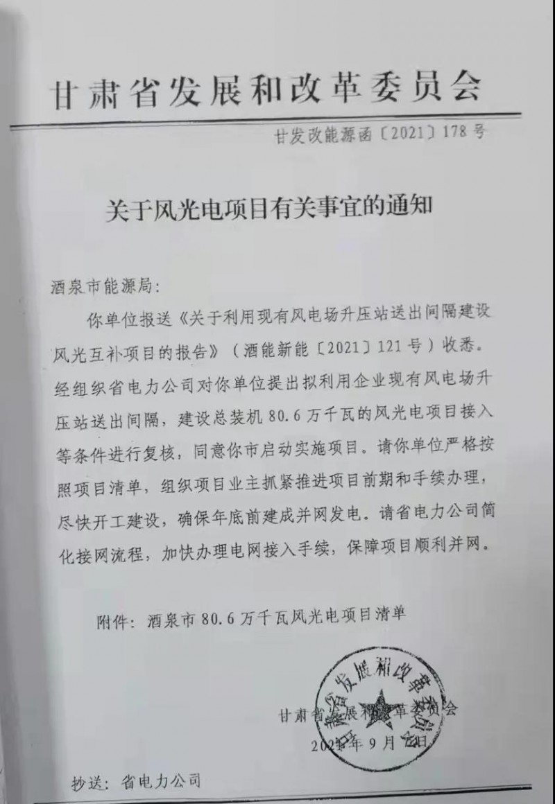 根據(jù)文件,酒泉該批次項(xiàng)目為利用現(xiàn)有風(fēng)電場升壓站送出間隔建設(shè)的風(fēng)光互補(bǔ)項(xiàng)目,省電力公司已經(jīng)對該批項(xiàng)目的接入條件進(jìn)行了復(fù)核。各項(xiàng)目業(yè)主需抓緊推進(jìn)項(xiàng)目前期和手續(xù)辦理,盡快開工建設(shè),確保年底前建成并網(wǎng)發(fā)電。省電力公司要簡化接網(wǎng)流程,加快辦理電網(wǎng)接入手續(xù)。