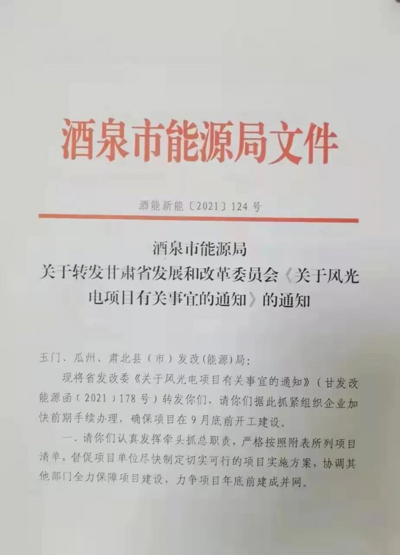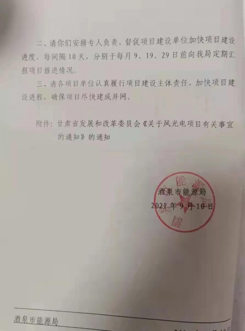酒泉市能源局也下發(fā)相應(yīng)文件要求項(xiàng)目在9月底前開工建設(shè)每間隔10天,在每月的9日、19日、29日向酒泉能源局定期匯報(bào)項(xiàng)目推進(jìn)情況,加快項(xiàng)目建設(shè)進(jìn)程,確保項(xiàng)目盡快建成并網(wǎng)。