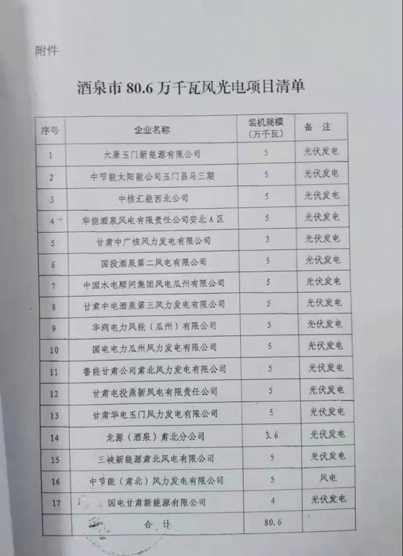 酒泉風(fēng)、光項(xiàng)目名單