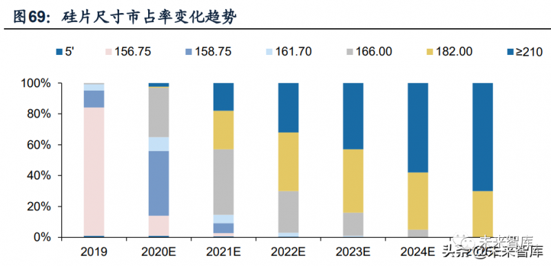 (1)背景:大尺寸化推動多環(huán)節(jié)降本,滲透提升成必然趨勢。在制造端,大尺寸硅片可以提升硅片、電池和組件產(chǎn)出量,從而攤薄單位生產(chǎn)成本;在組件端, 大尺寸硅片能夠有效提升組件功率,通過優(yōu)化電池和組件的設(shè)計(jì)提高組件效率,降低單瓦成本;在系統(tǒng)端,單片組件功率和轉(zhuǎn)換效率的提升可以減少支架及匯流箱等 固定成本。因此,大尺寸化能夠有效攤薄各環(huán)節(jié)加工及BOS成本,推動度電成本下降,大尺寸趨勢確定。據(jù)PV-Infolink預(yù)測,2020年硅片市場仍以158/166mm為 主,市占率為74%,但2021年時182/210mm尺寸硅片市占率將擴(kuò)大至18%,此后逐年上升。