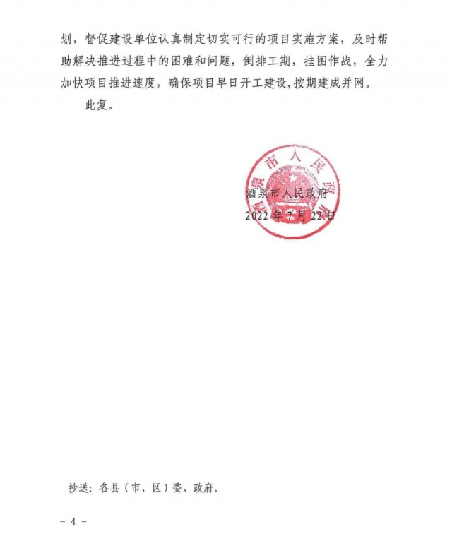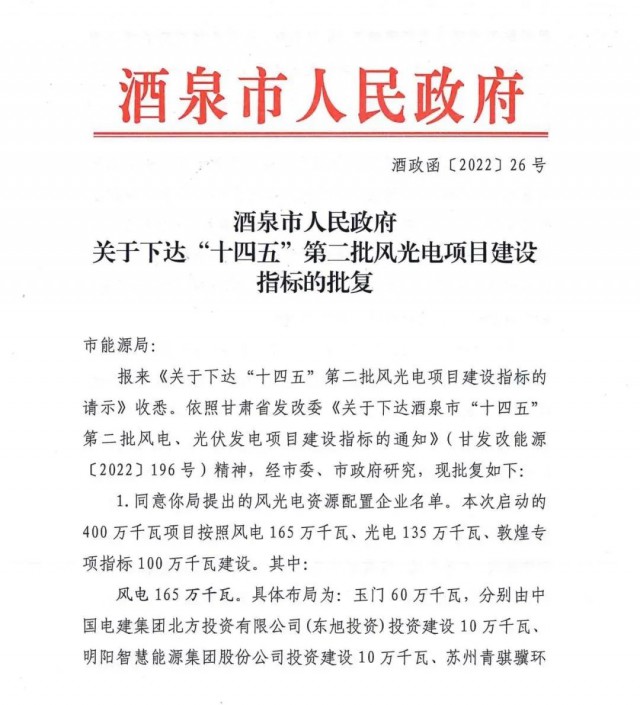 7月22日,甘肅酒泉市人民政府下發(fā)“十四五”第二批風(fēng)光項目建設(shè)指標(biāo)的批復(fù),按照風(fēng)電1.65GW、光伏1.35GW以及敦煌1GW專項指標(biāo)劃分,規(guī)??傆嫗?GW,光伏、風(fēng)電總規(guī)模各為2GW。