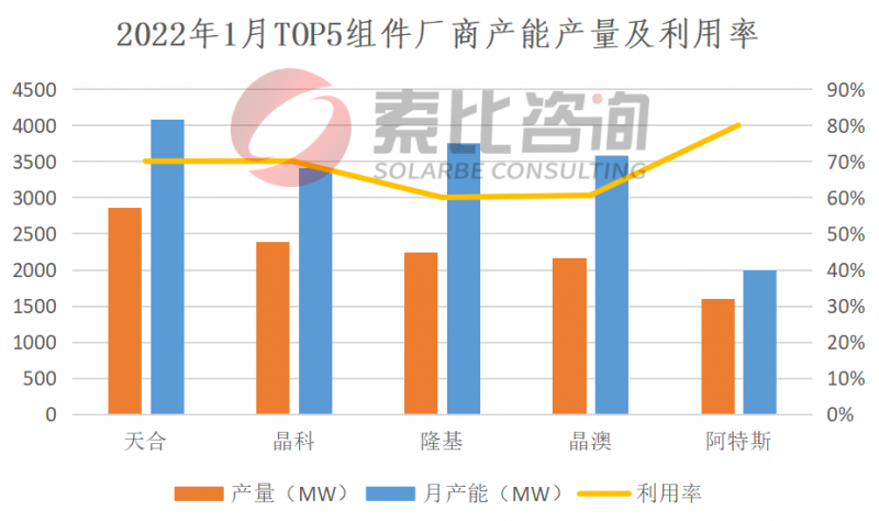 2022年1月,終端需求大幅上升,國內(nèi)組件產(chǎn)量19.73GW,環(huán)比大增23.31%。按照產(chǎn)量排名,天合、晶科、隆基、晶澳、阿特斯位列前五,企業(yè)總產(chǎn)量11.27GW,占比57.12%,綜合開工率68.11%。預(yù)計(jì)2022年2月,海外需求還會有所提升,組件產(chǎn)量預(yù)計(jì)持平或小幅上漲。