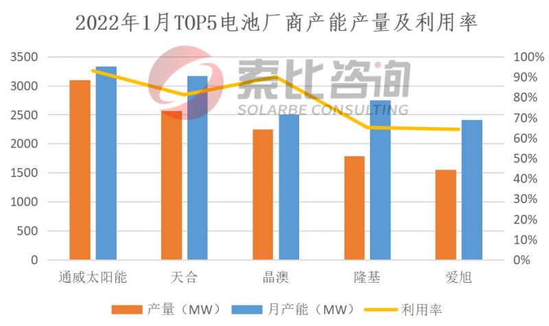 2022年1月,電池企業(yè)產(chǎn)量20.86GW,環(huán)比大增16.99%。按照產(chǎn)量排名,通威、天合、晶澳、隆基、愛旭位列前五,企業(yè)總產(chǎn)量11.26GW,占比53.98%,綜合利用率78.68%。垂直一體化企業(yè)綜合利用率率79.48%,主流電池企業(yè)綜合利用率76.59%。