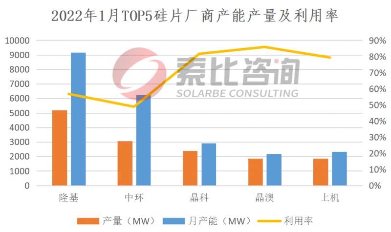 2022年1月,國內(nèi)12家多晶硅企業(yè)在產(chǎn),大全和永祥新增產(chǎn)能陸續(xù)釋放,產(chǎn)量再創(chuàng)新高。1月份國內(nèi)多晶硅產(chǎn)量為5.2萬噸(約20.54GW),環(huán)比增長6.56%。按照產(chǎn)量排名,永祥、協(xié)鑫、大全、新特、東方希望位列前五,企業(yè)總產(chǎn)量4.51萬噸,占比86.7%,綜合利用率90.6%。索比咨詢預(yù)期2月份硅料產(chǎn)量繼續(xù)小幅上漲。從供應(yīng)端來看,1月份新特、大全、永祥、協(xié)鑫擴(kuò)產(chǎn)增量繼續(xù)釋放。從需求端來看,國內(nèi)和海外市場一季度終端需求受訂單延期和免稅期截止等因素影響,相較往年將有一定程度增長;此外,硅片企業(yè)迅速提升開工率,硅料需求短期內(nèi)大幅增加。