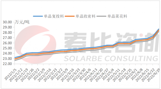 回顧2022年上半年,硅料價格整體呈現(xiàn)單邊上漲趨勢,單晶復(fù)投料、單晶致密料、單晶菜花料均價漲幅分別為23.14%、23.24%、23.61%。