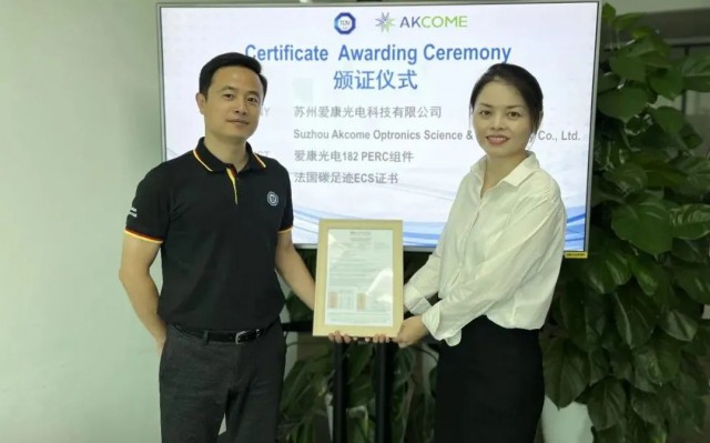 近日,TüV南德意志集團(tuán)(以下簡(jiǎn)稱(chēng)“TüV南德”)順利為蘇州愛(ài)康光電科技有限公司(以下簡(jiǎn)稱(chēng)“愛(ài)康光電”)完成182 PERC系列組件產(chǎn)品法國(guó)碳足跡ECS證書(shū)的交付,助力愛(ài)康光電的全球化戰(zhàn)略布局。