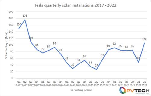 (特斯拉2017Q1-2022Q2太陽(yáng)能設(shè)備安裝量 圖源:PVTECH)