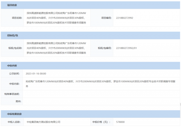 1月30日,深圳高速新能源控股有限公司公示了擬收購廣東陽春市120MW光伏項(xiàng)目40%股權(quán)、興寧市200MW光伏項(xiàng)目30%股權(quán)、羅定市100MW光伏項(xiàng)目20%股權(quán)技術(shù)盡職調(diào)查的中標(biāo)候選人,中檢集團(tuán)南方測試股份有限公司以57.8萬元的報(bào)價(jià)中標(biāo)。