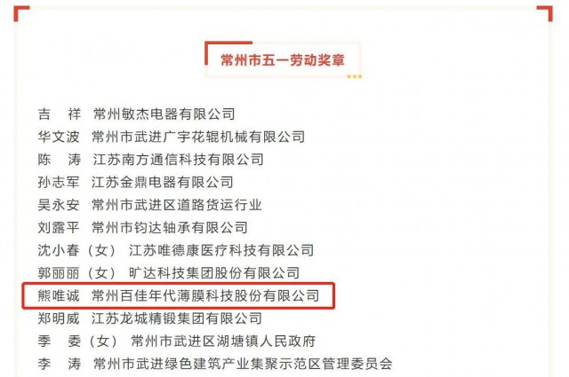 致敬勞動者,奮進新征程。勞動節(jié)前夕,常州市舉行慶?!拔逡弧眹H勞動節(jié)大會,對為我市經(jīng)濟發(fā)展作出貢獻的先進集體和先進個人進行表彰,動員和號召全市廣大職工以先進為標桿,大力弘揚勞模精神勞動精神工匠精神,為建設“兩湖”創(chuàng)新區(qū)、打造“新能源之都”、決勝“萬億之城”作出新的更大貢獻。會上,百佳年代新材料研究院研發(fā)總監(jiān)熊唯誠博士榮獲“常州市五一勞動獎章”榮譽。