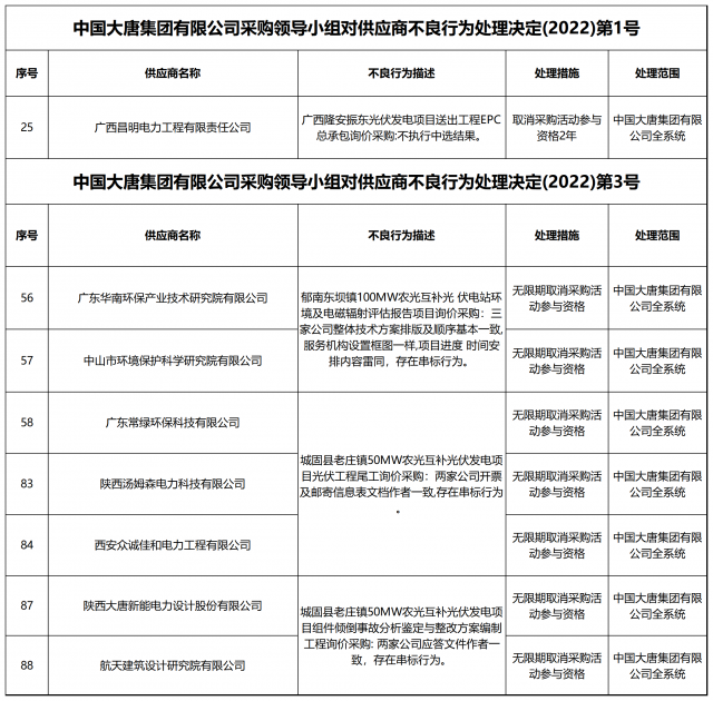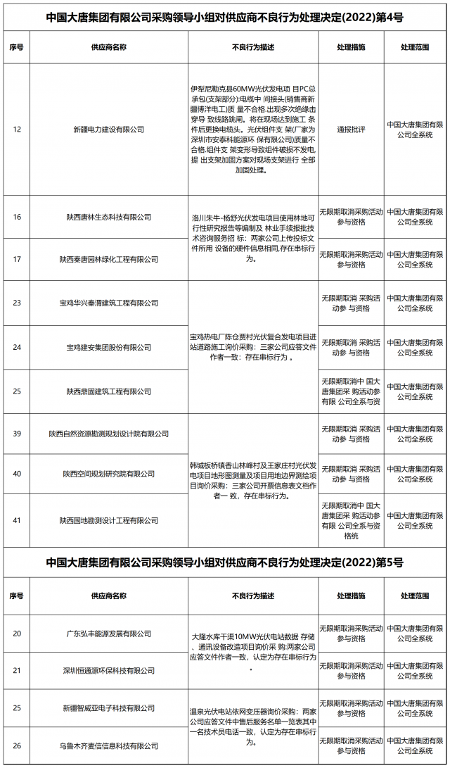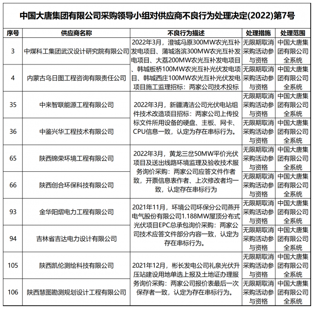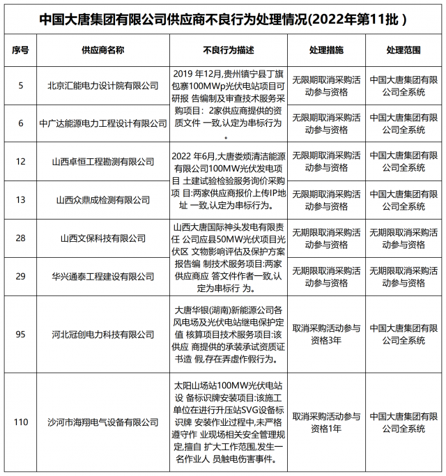 12月13日,中國大唐集團(tuán)有限公司關(guān)于供應(yīng)商不良行為處理情況的公告 (2022年第12批)公示,對出現(xiàn)不誠信行為、履約不力以及產(chǎn)品質(zhì)量等問題的供應(yīng)商進(jìn)行了處理。本批次大唐集團(tuán)共公布受處罰企業(yè)137家,其中,光伏相關(guān)企業(yè)共6家。