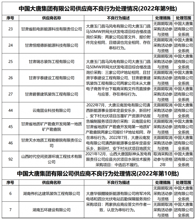 中國大唐集團(tuán)有限公司關(guān)于供應(yīng)商不良行為處理情況的公告(2022年第12批)
