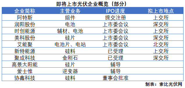 已經(jīng)到來的2023年,A股市場還將迎來更多重量級的光伏企業(yè)。其中,全球組件龍頭阿特斯已提交注冊,電池片“龍三”潤陽股份、硅片新勢力美科股份已成功通過上市委會議,硅料巨頭新特能源已獲受理。此外,協(xié)鑫科技、高景太陽能也已經(jīng)分別獲得董事會批準(zhǔn)和進(jìn)入輔導(dǎo)期。