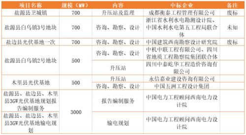 自去年以來,該企業(yè)就鹽源縣、鹽邊縣、木里縣3GW光伏基地項目先后發(fā)起了近10個光伏基地項目招標,包括3GW光伏基地規(guī)劃、輸電規(guī)劃、單獨項目的升壓站以及項目基地的咨詢、勘察、設(shè)計等。從公開的投標記錄可以看到,參與投標的企業(yè)不乏國內(nèi)知名電力設(shè)計院以及地方設(shè)計院系。但在眾多企業(yè)參與投標的同時,部分項目則由于中標企業(yè)未簽署相關(guān)合同變?yōu)閺U標。
