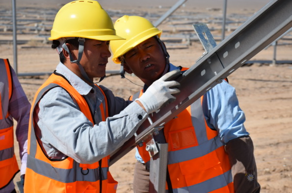 在樁基施工過程中,克服作業(yè)面環(huán)境惡劣、氣溫高紫外線強、常伴有沙塵暴等因素,以每日、每周為節(jié)點嚴(yán)格落實施工部署,優(yōu)化工序施工方案,采取測量放點精準(zhǔn)定位,樁位中心清晰標(biāo)識,樁機安裝水平尺,專人盯控預(yù)埋件,有效避免樁位、樁身垂直度、樁長、樁頂標(biāo)高、預(yù)埋件定位等工序風(fēng)險點出現(xiàn),5月27日優(yōu)質(zhì)完成樁基混凝土澆筑,為項目安全快速推進(jìn)奠定了堅實的基礎(chǔ)。8月12日,玉門40萬千瓦光伏發(fā)電工程項目首批次光伏板順利安裝,項目正式進(jìn)入電氣安裝階段,同時開啟了建設(shè)目標(biāo)“加速度”。10月30日項目提前40天順利完工。