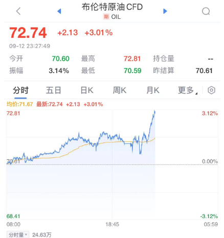美東時(shí)間9月12日,國際油價(jià)暴漲,WTI原油日內(nèi)漲超3.5%,布倫特原油漲超3%。