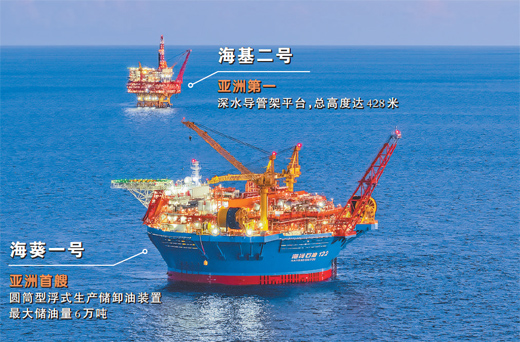 這一天,兩個(gè)“能源重器”——亞洲首艘圓筒型浮式生產(chǎn)儲(chǔ)卸油裝置(FPSO)“??惶?hào)”、亞洲第一深水導(dǎo)管架平臺(tái)“?;?hào)”攜手上崗,標(biāo)志著我國(guó)全類(lèi)型深水油氣裝備的設(shè)計(jì)、建造和安裝能力達(dá)到世界一流水平。