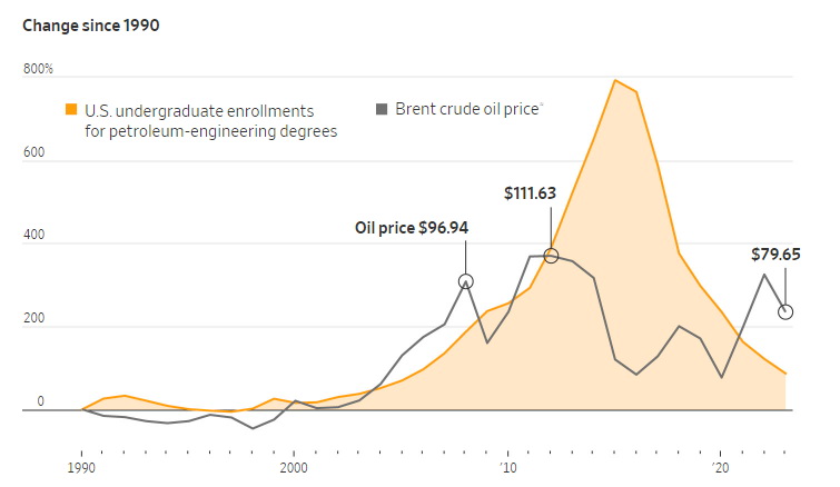 但根據(jù)美國教育部的數(shù)據(jù),在2016年至2021年期間,布倫特原油價格幾乎翻了一番,石油工程專業(yè)的畢業(yè)生人數(shù)卻減少了逾一半。