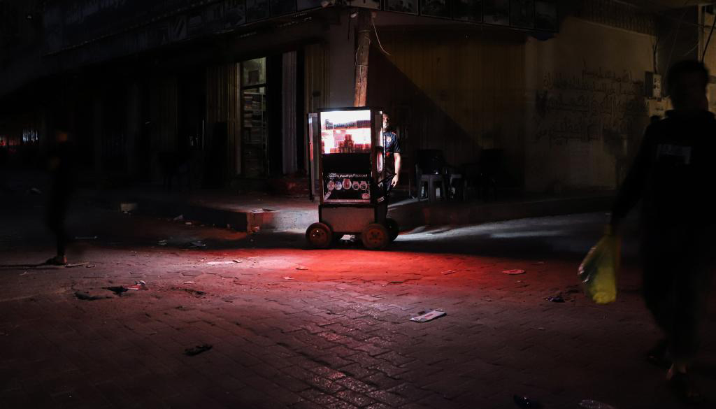 當(dāng)?shù)貢r間2023年10月16日,加沙地帶的汗尤尼斯,黑暗中的小商販。