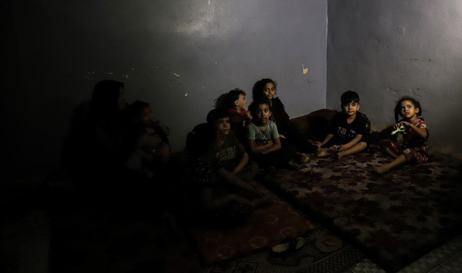 當(dāng)?shù)貢r間2023年10月16日,加沙地帶的汗尤尼斯,孩子們在黑暗的房間中。